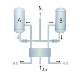 1、集成式。選用一個(gè)集成閥門,整個(gè)系統(tǒng)為一體(氣源預(yù)處理、兩個(gè)吸附塔、產(chǎn)品氣貯罐)。